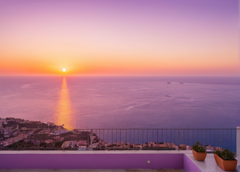 The sky outside the panoramic windows was painted in vibrant shades of orange and purple. The sun dipped slowly toward the horizon, casting a golden glow across the calm Mediterranean waters.